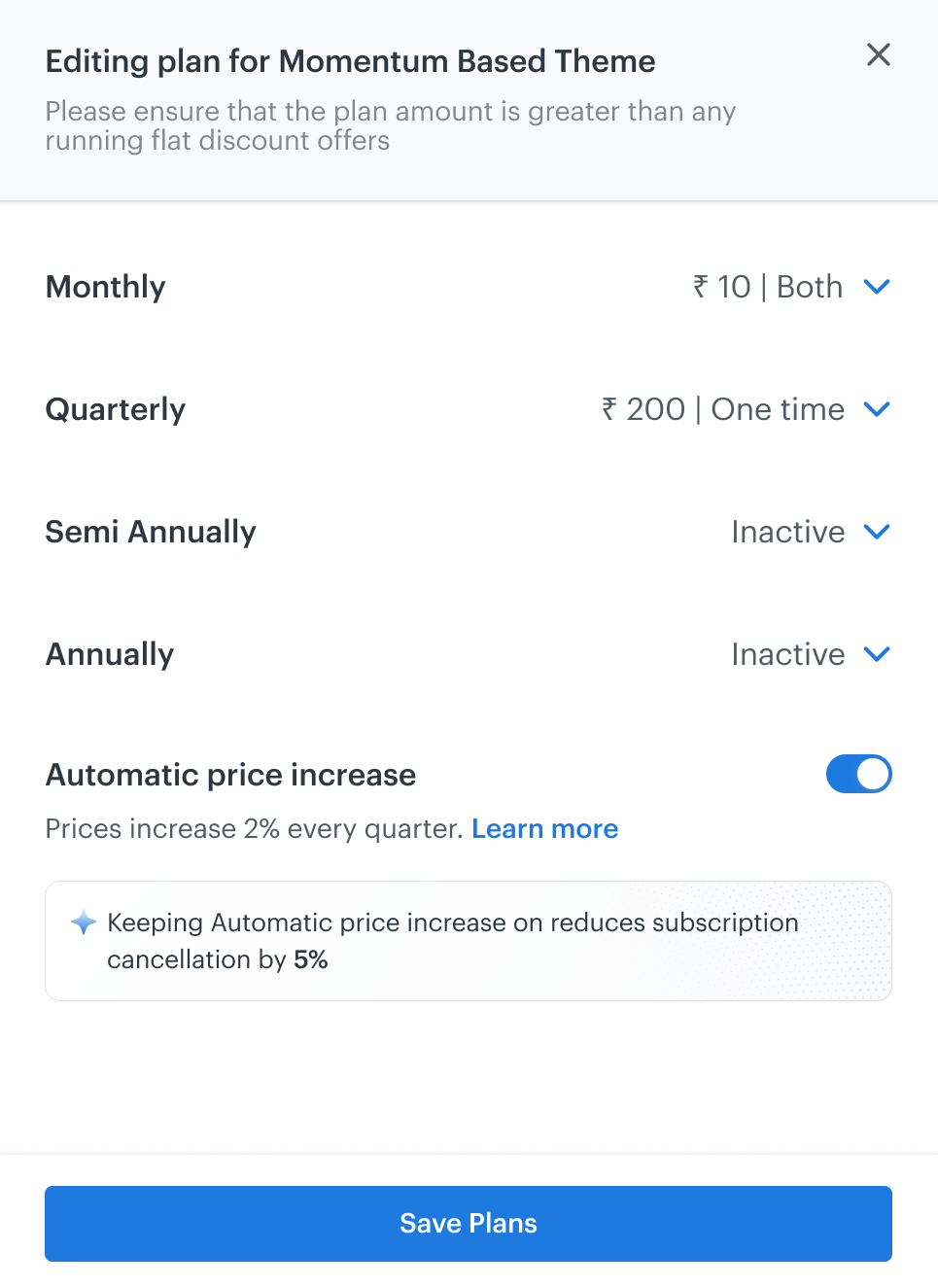 When enabled, your subscription prices will increase by 2% every quarter. This helps ensure your pricing keeps up with the value you deliver to your subscribers.