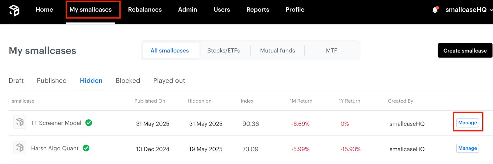 Select My smallcases from the navigation menu and click on “Manage” to view Strategy tags