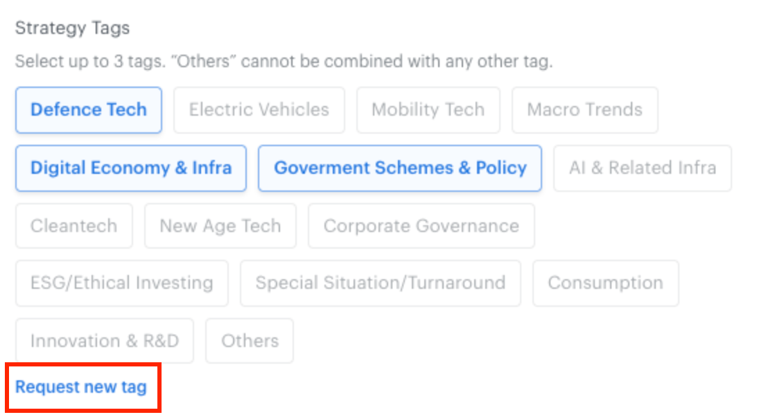 For “Tracker” & “Thematic” smallcase types, you can request for a new strategy tag to be added. Post approval, the new tags will be made available for selection on the Publisher Platform.